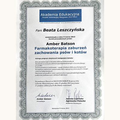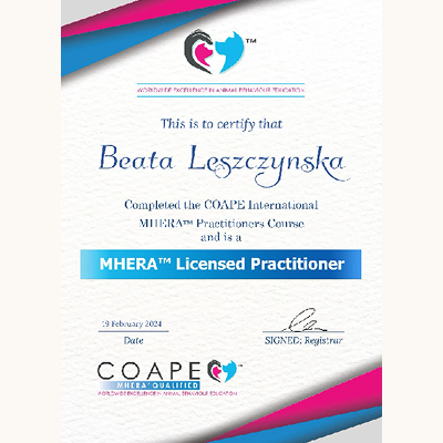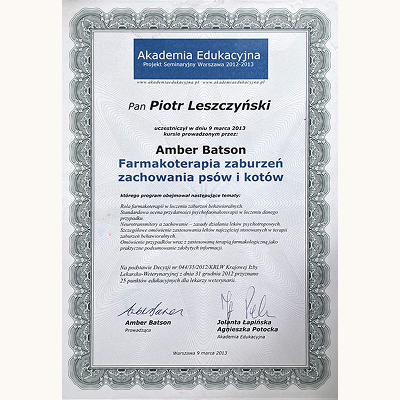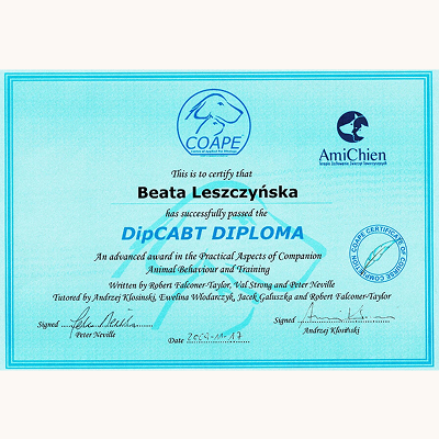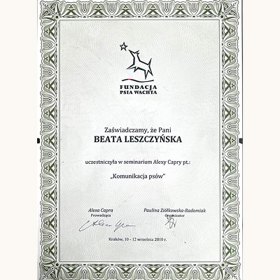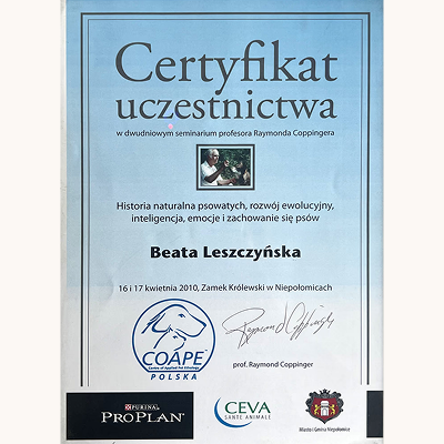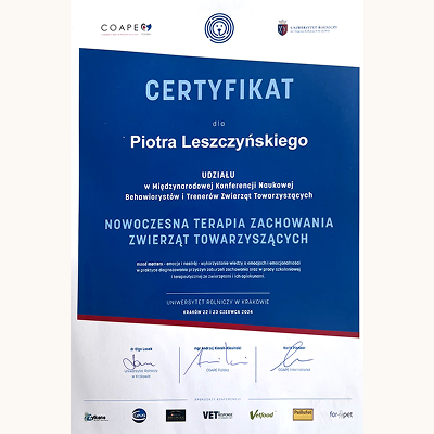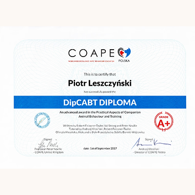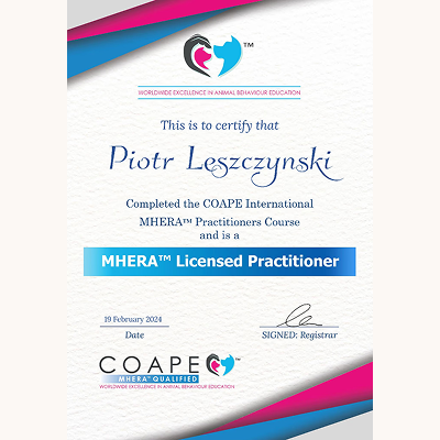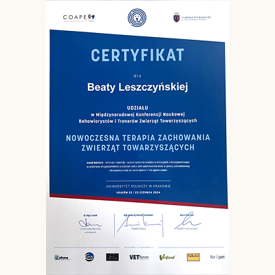 Stale się szkolimy, aby lepiej rozumieć potrzeby czworonogów i jeszcze skuteczniej pomagać w budowaniu harmonijnych relacji między zwierzętami a ich opiekunami. Wybrane certyfikaty poniżej (wszystkie się nie zmieszczą :).