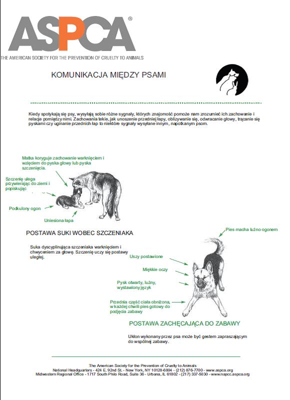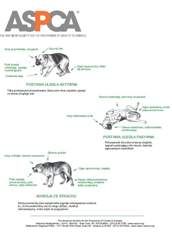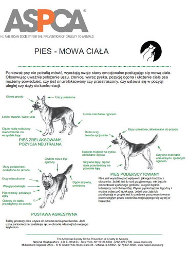 Za zgodą ASPCA możemy zaprezentować ulotkę, w której pokazano w bardzo przystępnej formie kilka podstawowych postaw ciała, jakie prezentują psy w różnych stanach emocjonalnych. Warto się z nimi zapoznać żeby wiedzieć, jakie informacje przekazują nam psy za pomocą języka ciała i na co powinniśmy zwracać szczególną uwagę.