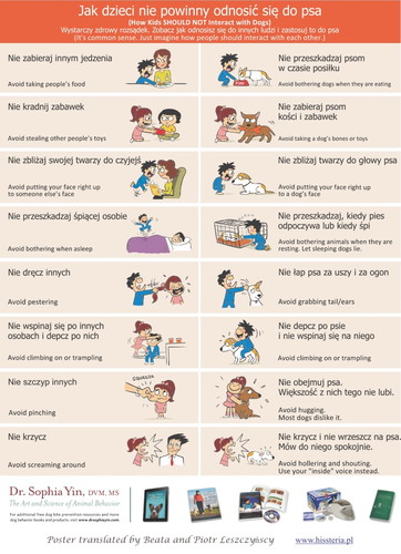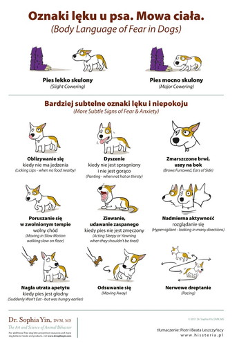 Oznaki lęku u psa. Mowa ciała. Dr Sophia Yin to znana amerykańska behawiorystka i lekarz weterynarii. W swojej pracy szczególną uwagę przykłada do mowy ciała zwierząt i komunikacji człowiek - zwierzę. Za jej zgodą publikujemy plakaty, które są doskonałym narzędziem edukacyjnym nie tylko dla dzieci, ale dla wszystkich zainteresowanych.